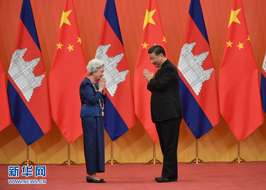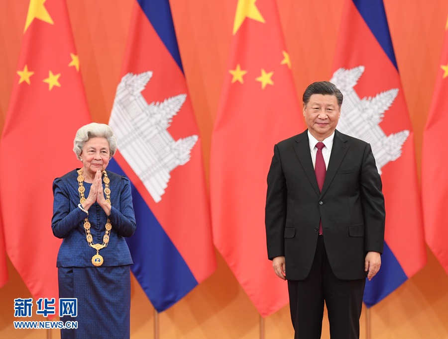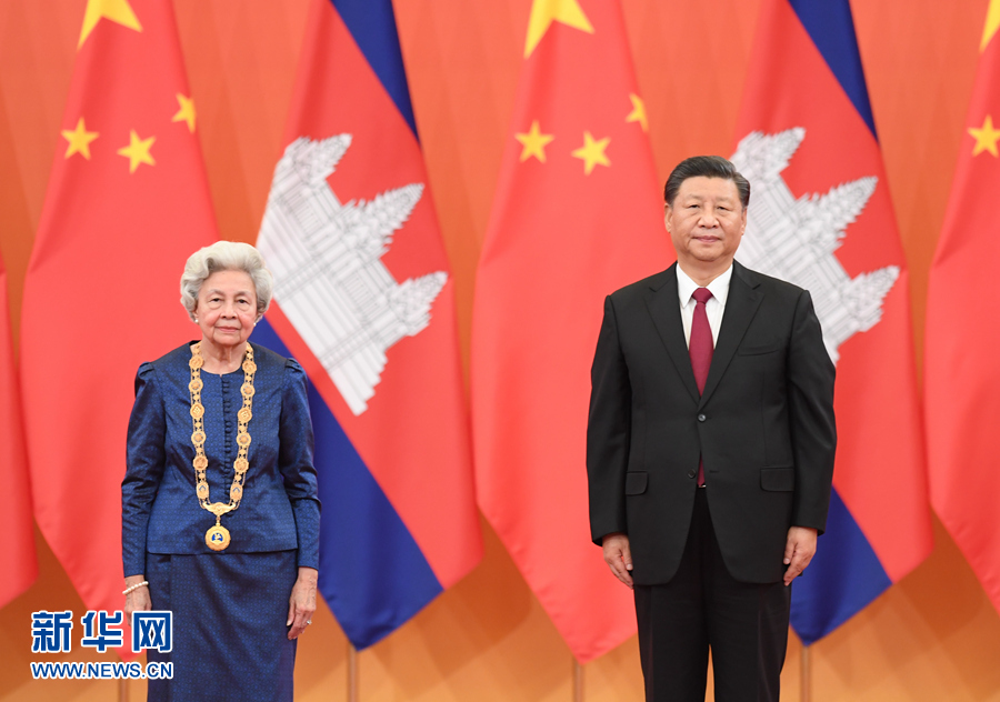 11月6日,国家主席习近平在北京人民大会堂为柬埔寨太后莫尼列举行中华人民共和国“友谊勋章”颁授仪式。新华社记者申宏摄